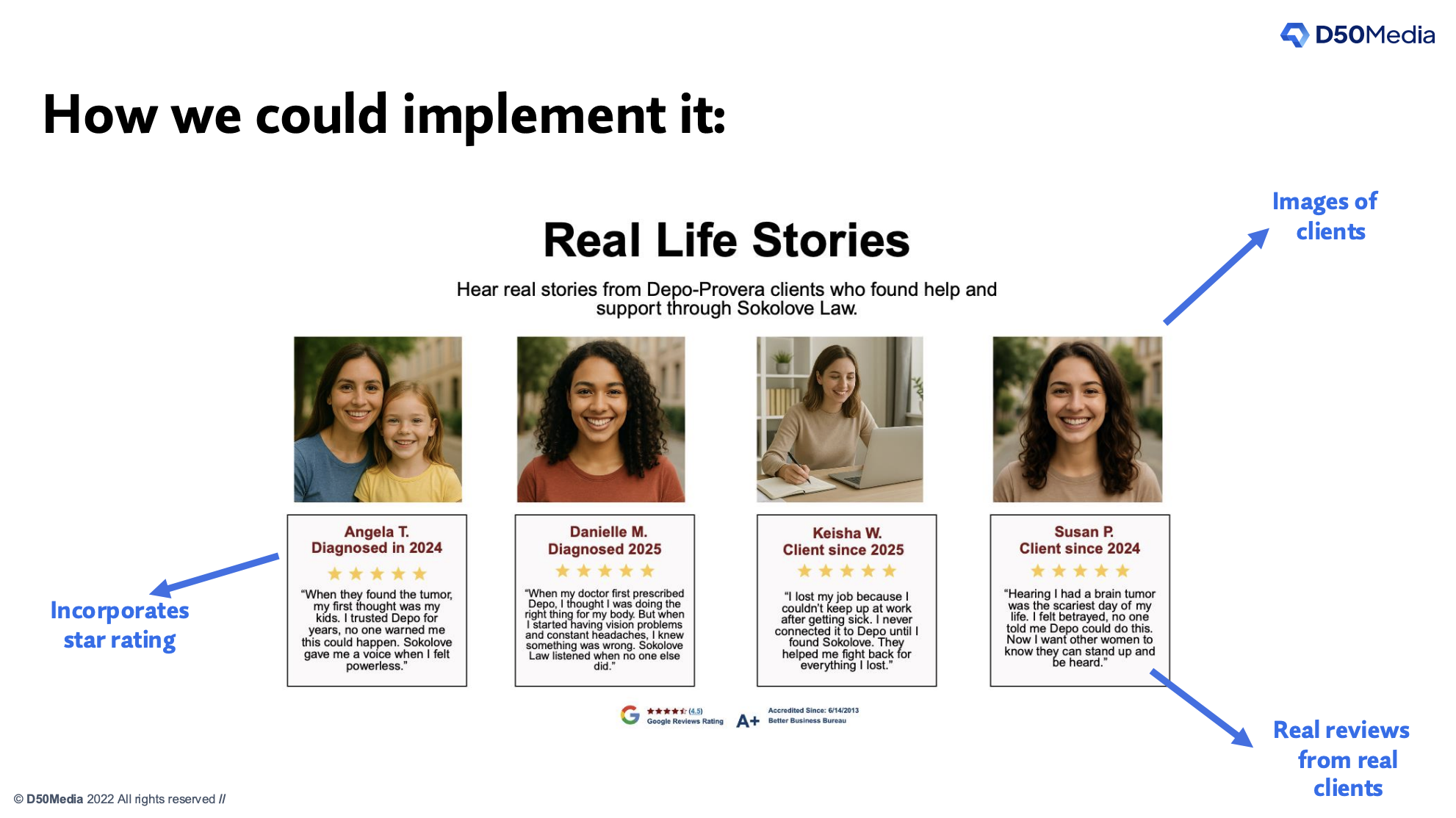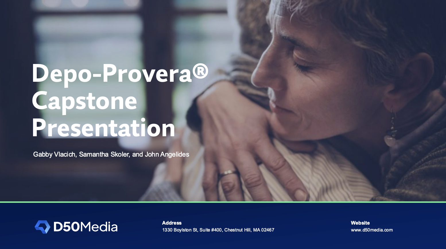 During my internship at D50 Media, I worked on a 6-week capstone project focused on a real client campaign for Depo-Provera. The project involved collaborating with a cross-functional team to support digital marketing efforts, including paid search strategy and creative development. We applied campaign insights to align messaging with target audiences and business goals. The capstone concluded with a formal presentation of our work to the full company and D50 Media’s executive team, showcasing strategy, execution, and key learnings from the project.
