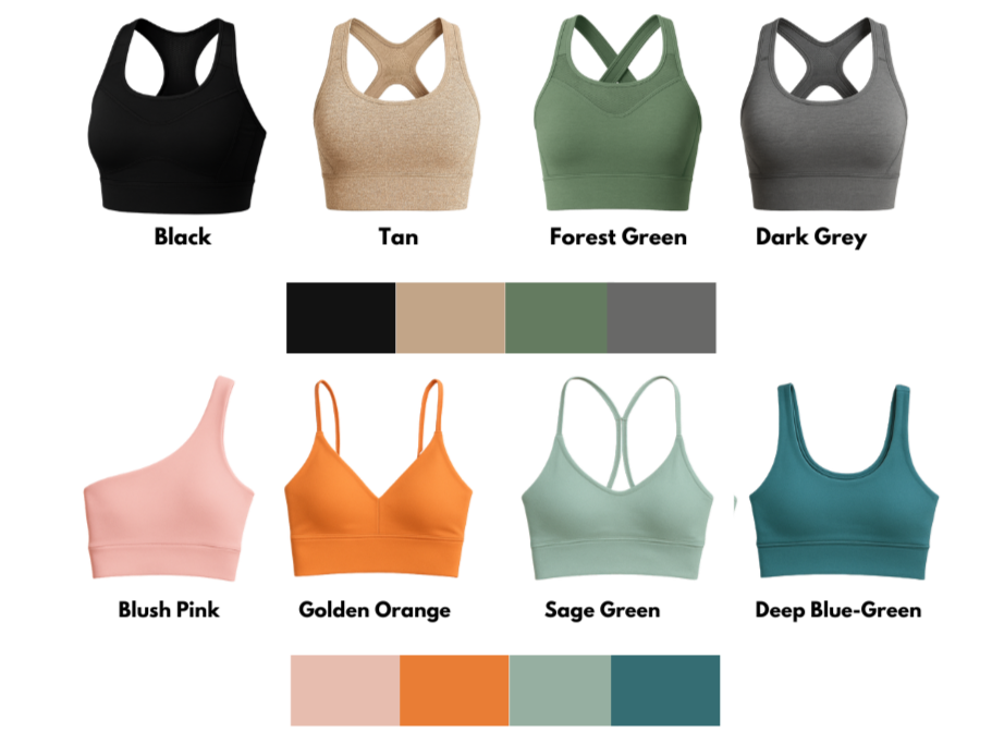 Based on these insights, we defined FLEXA’s brand positioning, target personas, and value proposition, and created two core products: a high-impact sports bra offering premium support at a more accessible price point, and a low-impact bra designed for high-sweat activities. I contributed to developing detailed product specifications, including material selection, silhouettes, support systems, pricing strategy, color assortments, and sourcing considerations.